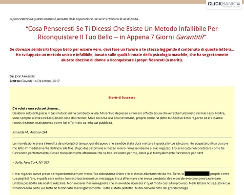 Desidero solo dirti grazie. Il tuo metodo mi ha cambiato la vita. Mi sentivo depresso e non ero affatto sicura che avrebbe funzionato nel mio caso. Inoltre, sono sempre scettica nell’acquistare cose da Internet. Ma è occorsa una sola settimana, proprio come ha detto tu! Adesso il mio ragazzo ed io ci siamo rimessi insieme, esattamente come hai affermato tu nella tua pubblicità.