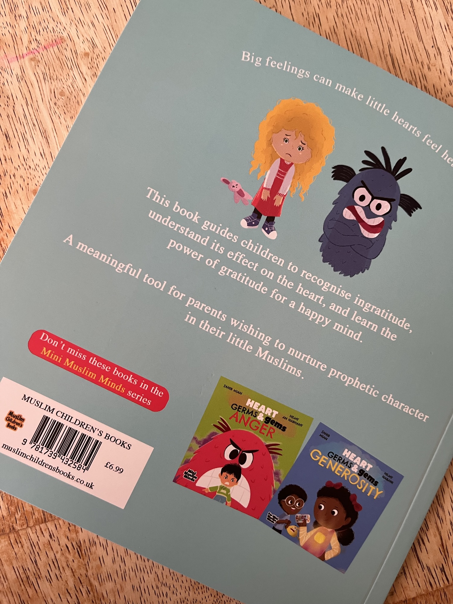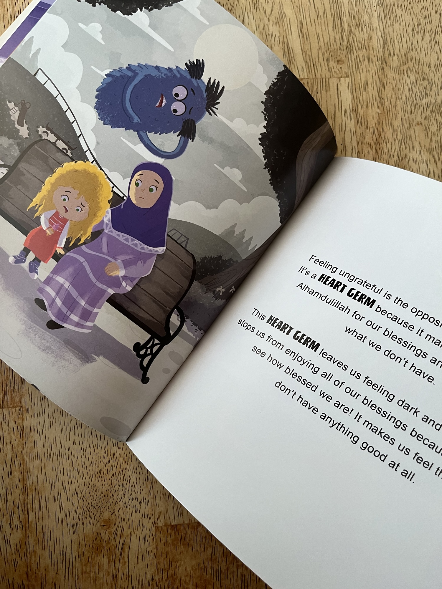 Heart Germs & Gems: Gratitude: Alhumdulillah is not just knowing that everything is a gift from Allah swt, it is feeling happy and thankful for all of it. The book explains gratitude and then the opposite, the germ in the heart, of being ungrateful. It provides ways to be more grateful, encouraging that one notices the blessings in life. There is an English translation of the verse in the Qur’an, Surah Ibrahim, “If you are grateful, I will give you more,” and then explains it in action and highlights how true happiness does not come from riches, but from gratitude and contentment.