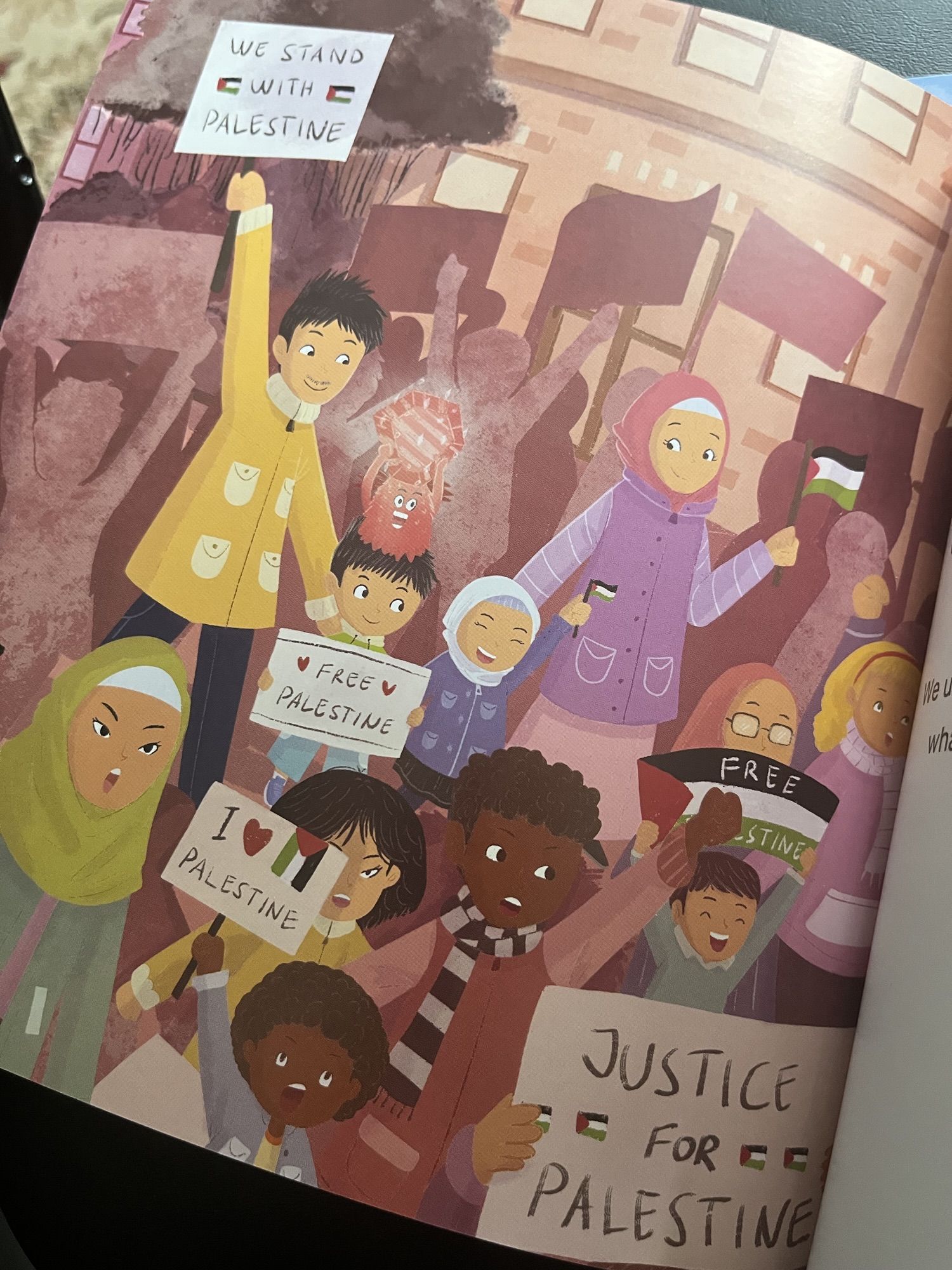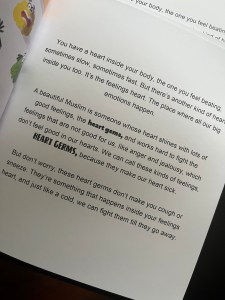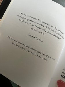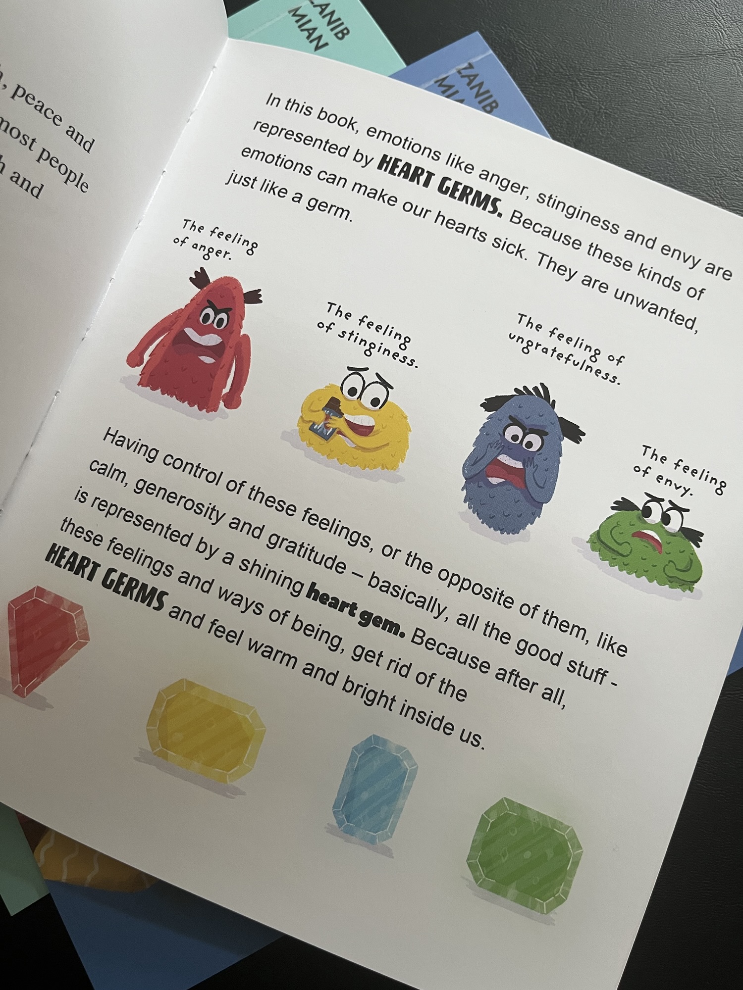 The first few pages of each 24 page book are the same: A reference to a Hadith regarding good character admitting people into Paradise, explaining the concept of Heart Germs and Heart Gems, and giving time to explaining that there is the heart that beats, and the one that is the “place where all our big emotions happen.” The format has the illustrations on the left and the text on the right in the small 7.5 x 8 soft bound books.
