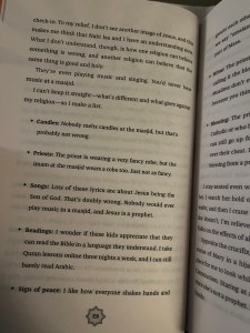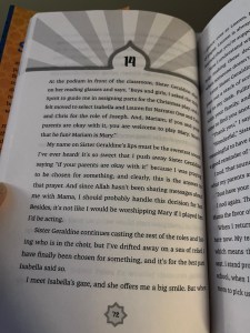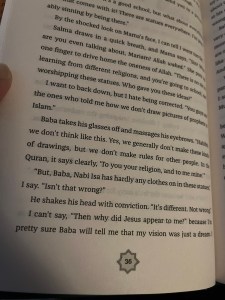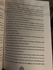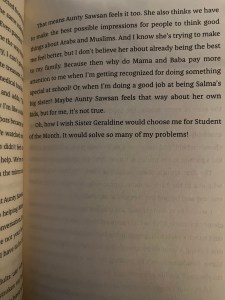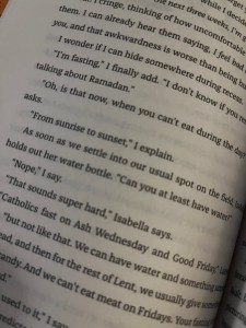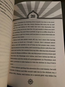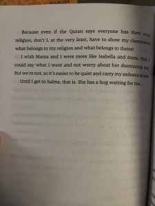 There is a lot of Islam in the book, and while Mariam sorts through what she thinks is right and wrong, I didn’t feel there was internalized Islamophobia or that she was ashamed of her faith. She doesn’t necessarily have all the answers about how to navigate the situations at hand, but she doesn’t hide her religion, or question the core of it. It is something she values and believes in. She does get a little hard on her mom’s accent and culture gets a little confusing, but even when she questions her grandmother’s prayer recipes, I didn’t feel that it was insulting or disrespectful.