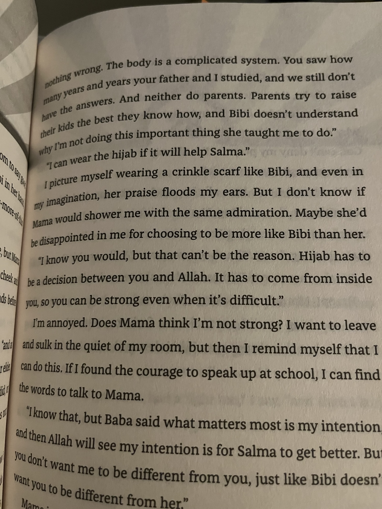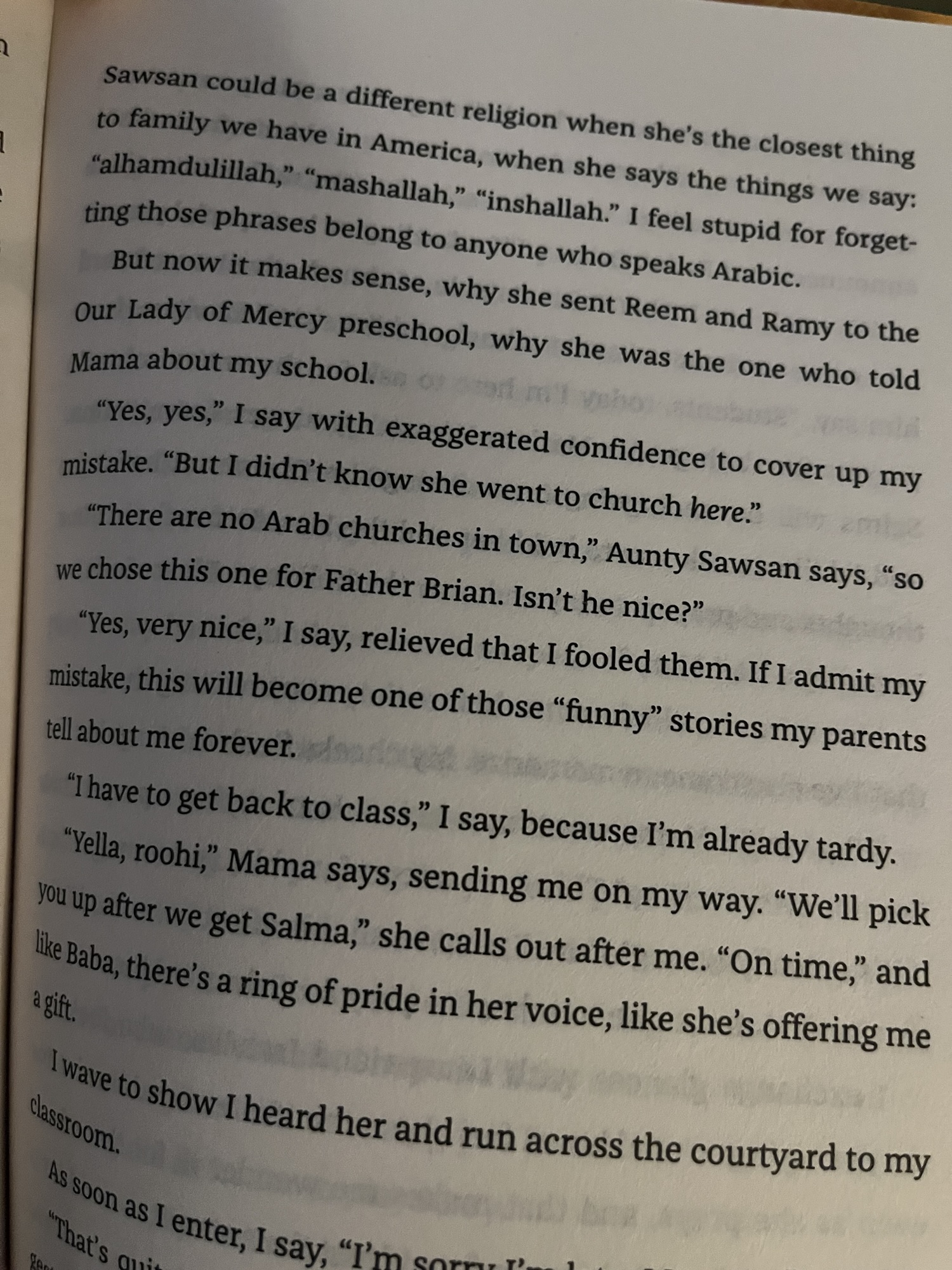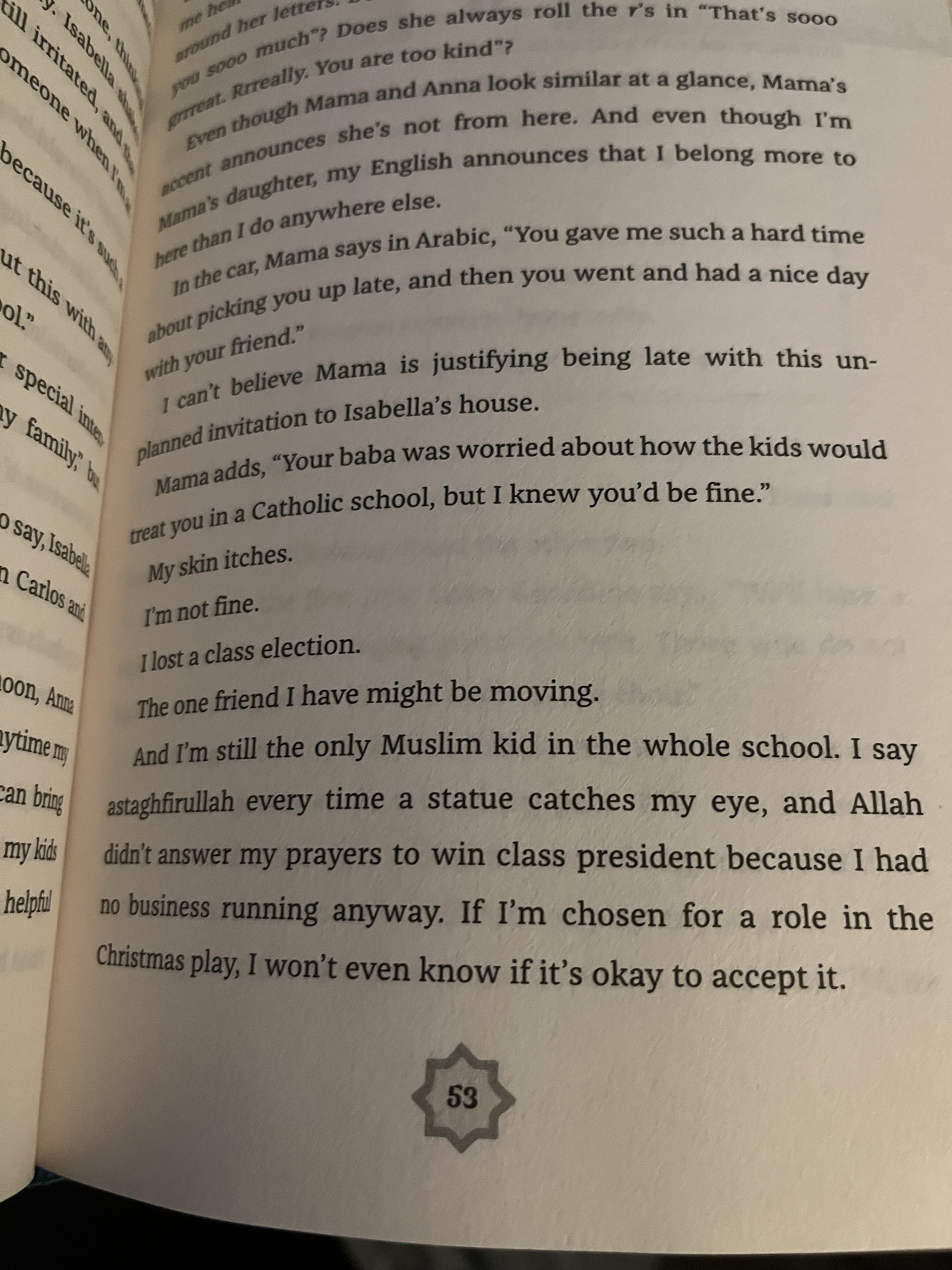 There is a lot of Islam in the book, and while Mariam sorts through what she thinks is right and wrong, I didn’t feel there was internalized Islamophobia or that she was ashamed of her faith. She doesn’t necessarily have all the answers about how to navigate the situations at hand, but she doesn’t hide her religion, or question the core of it. It is something she values and believes in. She does get a little hard on her mom’s accent and culture gets a little confusing, but even when she questions her grandmother’s prayer recipes, I didn’t feel that it was insulting or disrespectful.