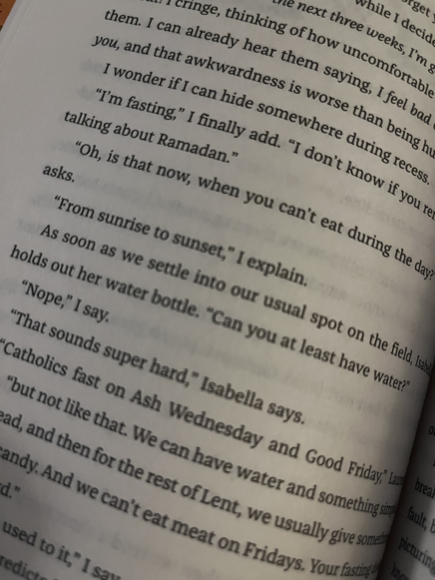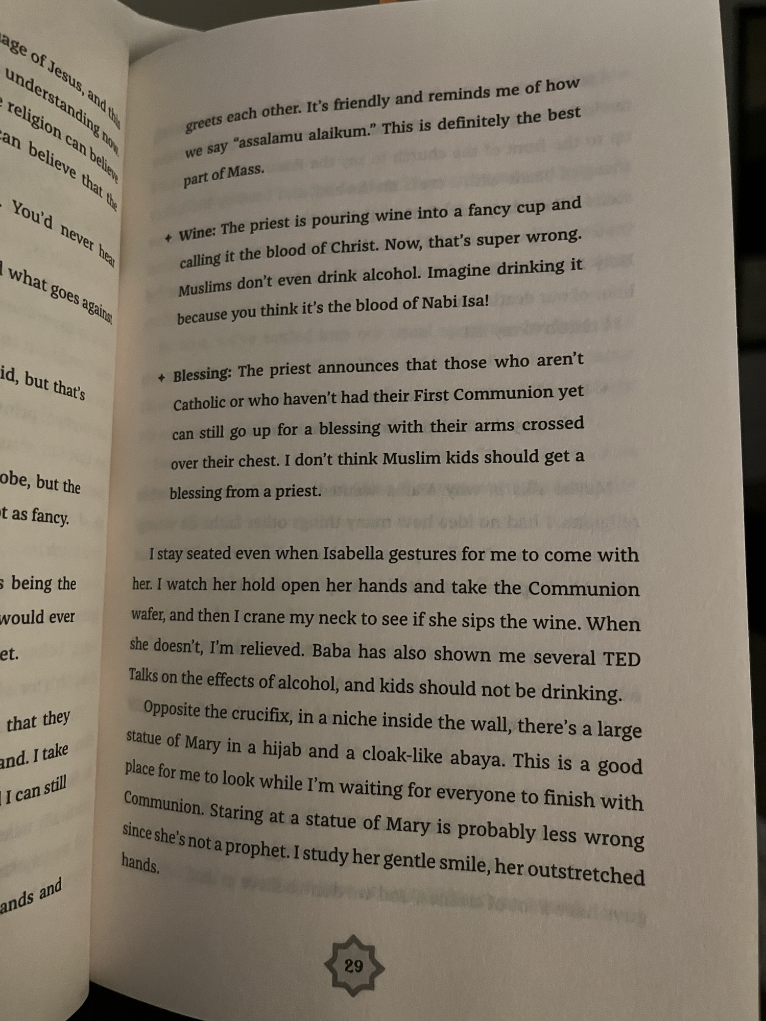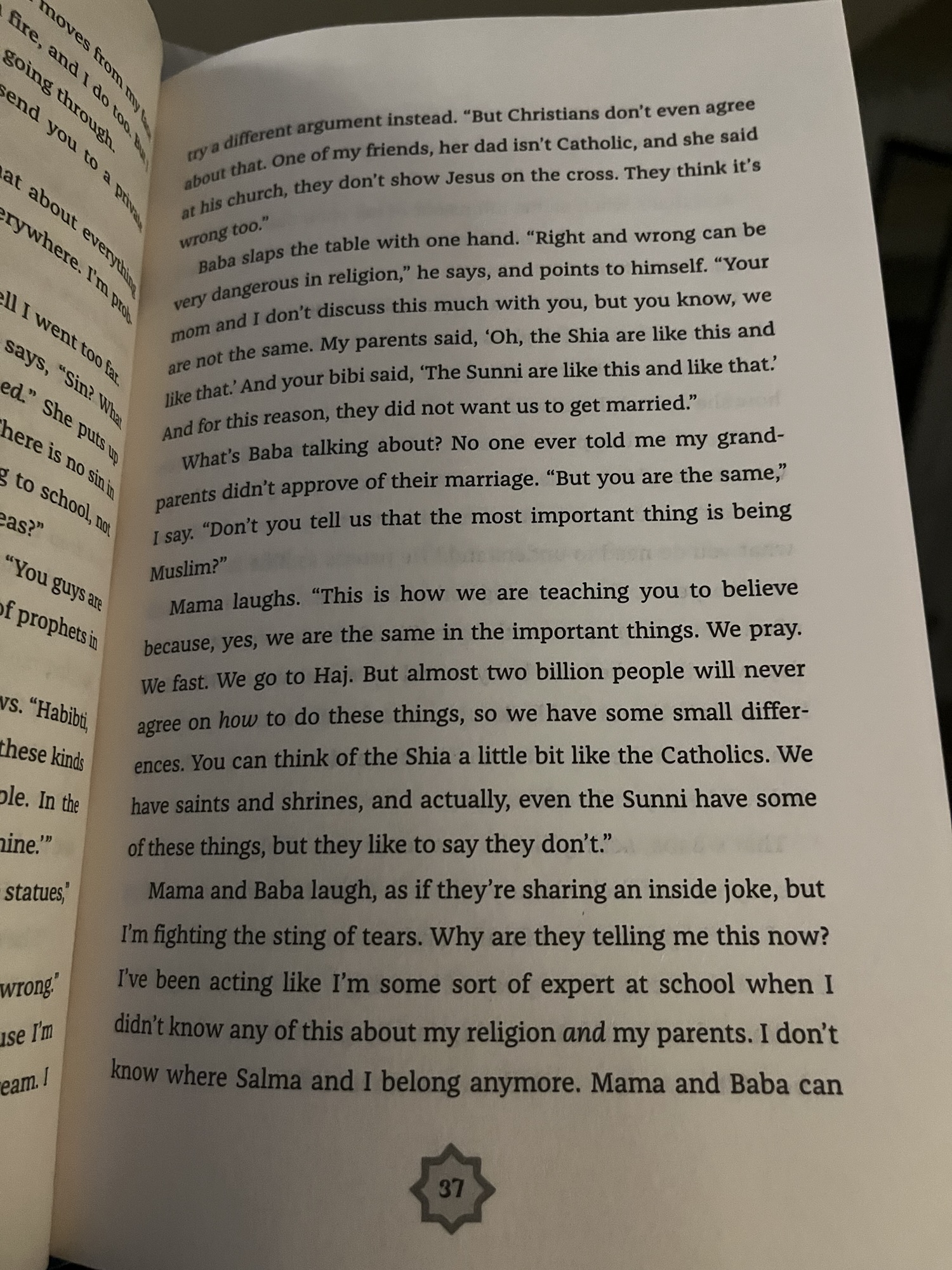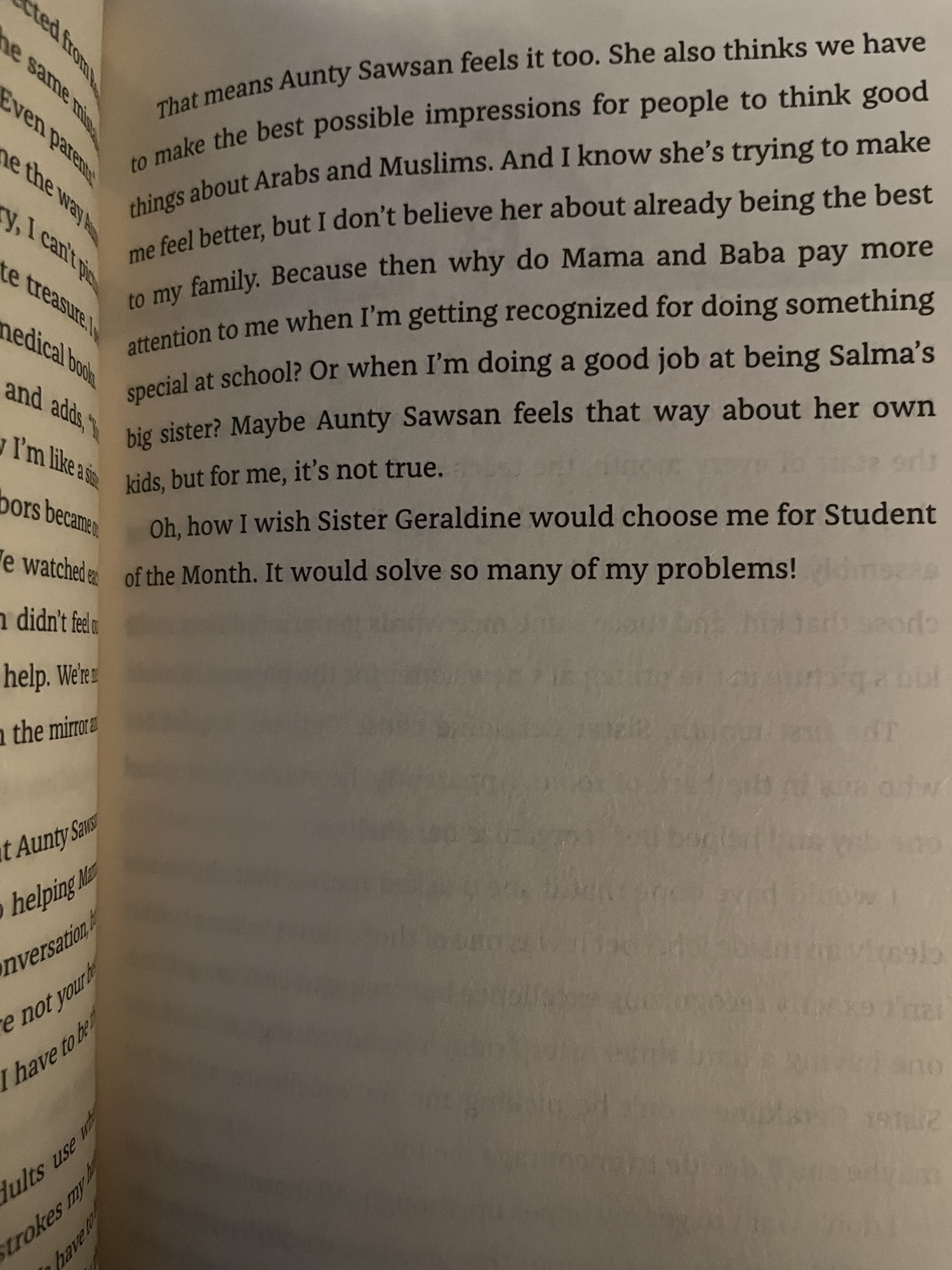 There is a lot of Islam in the book, and while Mariam sorts through what she thinks is right and wrong, I didn’t feel there was internalized Islamophobia or that she was ashamed of her faith. She doesn’t necessarily have all the answers about how to navigate the situations at hand, but she doesn’t hide her religion, or question the core of it. It is something she values and believes in. She does get a little hard on her mom’s accent and culture gets a little confusing, but even when she questions her grandmother’s prayer recipes, I didn’t feel that it was insulting or disrespectful.