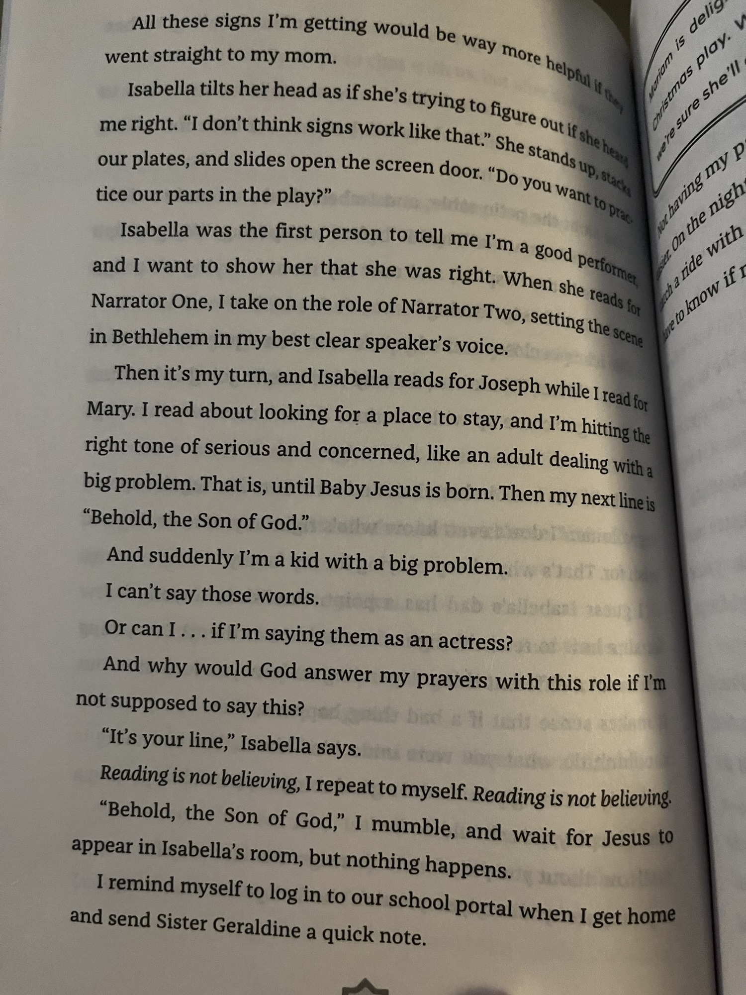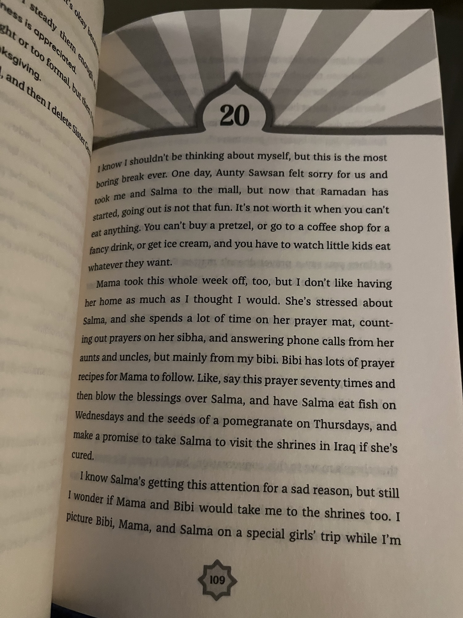 In 188 pages, this middle grade book packs a lot in: immigrant children expectations, the similarities and differences between Catholics and Muslims, Sunnis and Shias, culture and religion, all while sixth grader Mariam is starting a new school, a Catholic one- as a Muslim, having her first period start during church, and handling her sister’s health crisis. Throw in Ramadan, Bibi coming to visit, family dynamics, friendships new and old, and a school Christmas play, and phew, just writing all that out seems exhaustive, yet somehow the book doesn’t get bogged down in the heaviness of it all. It stays relatable, funny even, interesting. The book’s short chapters, Mariam’s voice, and the author’s ability to make this Mariam’s story, not an expectation or explanation of how all Muslims, or Iraqis, or immigrants, etc., should be, really is well done. Written first person through Mariam’s perspective, allows even her lens of comparing what she is seeing at her Catholic school with her Muslim upbringing, to not come across as critical or overly agenda filled, it is just a girl leading with her heart and making sense of life. A lot, according to the backmatter, is based on the author’s own life, and readers should know they may or may not agree with her conclusions, and her families practices, but I think this book has a lot of potential to be enjoyed on the surface, and start dialogue and understanding if one chooses to look deeper. I additionally think with Ramadan and Christmas aligning again in a few years, that this book will continue to have wide appeal and be a great resource to remind us that we often have more alike than we think. Just one scene really bothered me, but, I’ll delve into that more below.