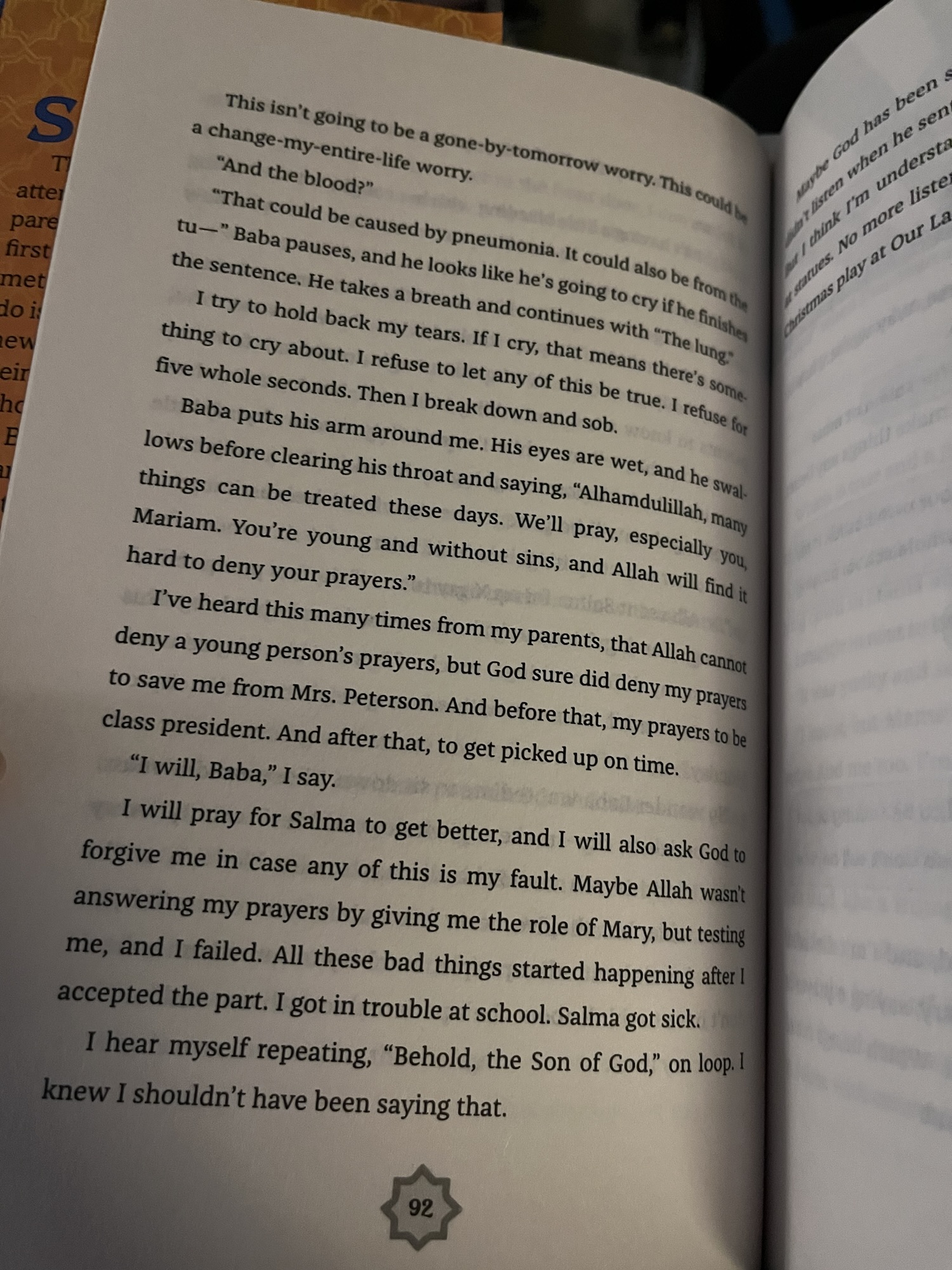 Mariam has a crush on a hospital volunteer, religious discussions, period starting, lying, impersonating her mom in school emails, jealousy, medical worry, illness.