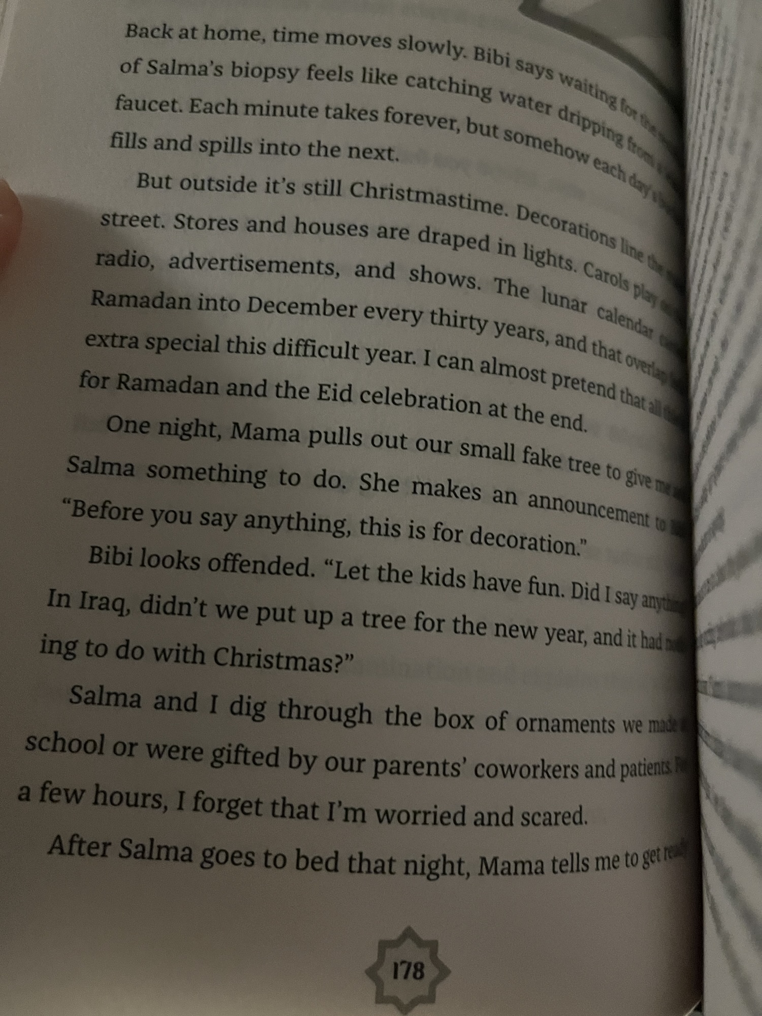 The only scene I felt was off was when at the end the family put up a Christmas tree, I get craft wise that it was perhaps to highlight the religion vs culture thread, but I took it as undermining so much of Mariam’s battles at school. By the family partaking in a clearly Pagan based Christian adopted practices when not prompted by any environment or outside expectation, I felt it was a bit forced in perhaps trying to justify that it is something a lot of Muslims do. Mariam through much of the book was trying to be respectful to her school and their practices while staying true to herself, the family got gifts for the Christian “family,” and they brough Eid gifts to them, so blurring the line when it wasn’t needed, seemed like so much of Mariam’s stress was for not. I feel the conversations about culture and religion were sufficient.
